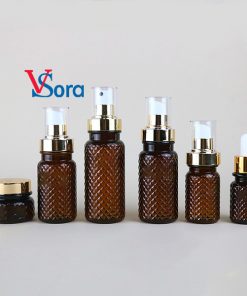 Thiết kế thân chai dạng quả trám tạo hiệu ứng khúc xạ ánh sáng đẹp mắt, giúp sản phẩm nổi bật trên kệ hàng. Thân chai màu nâu sậm sang trọng, kết hợp nắp màu vàng ánh kim, mang lại cảm giác cao cấp, tinh tế và đồng nhất trong toàn bộ set.